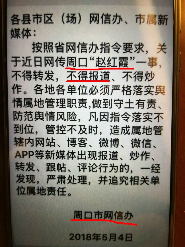 2018年5月4日,周口市网信办发出通知,要求新媒体不得报道周口“赵红霞”?上图喽!
