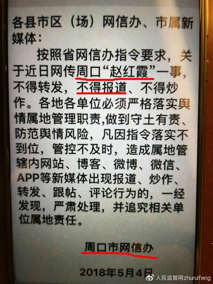 “周口杨红霞”——杨瑞的妹妹杨海燕又给何光伟发了一份落款“周口市网信办”指令。该指令称:“各县市区(场)网信办、市属新媒体:按照省网信办指令要求,关于近日网传周口“赵红霞”一事,不得转发,不得报道、不得炒作。各地各单位必须严格落实舆情属地管理职责,做到守土有责、防范舆情风险,凡因指令落实不到位,管控不及时,造成属地管辖内网站、博客、微博、微信、APP等新媒体出现报道、炒作、转发、跟帖、评论行为的,一经发现,严肃处理,并追究相关单位属地责任。周口市网信办 2018年5月4日。