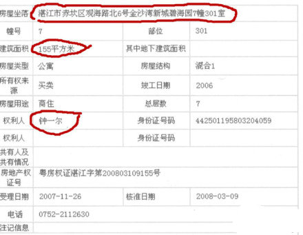 4.湛江市赤坎区观海路北6号金沙湾新城碧海园7301房,洋房式产权房,产权人为钟一尔,房产证号为:粤房权证湛江字第200803109155号,面积155平方米,价值1250000元。