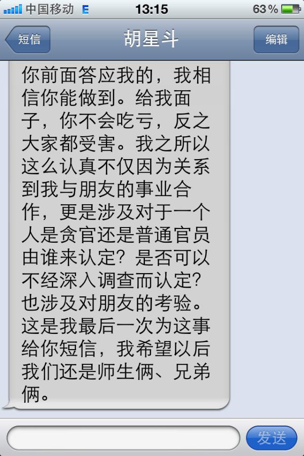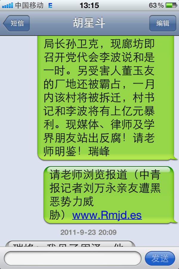 三、2011年9月16日18点23分,胡星斗教授发来手机短信:瑞峰:我的多年好友、原《瞭望》副主编、现北大一个研究院副院长刘东昌教授的亲戚正是那个廊坊秘书长,刘多次找我求情,希望能删除你网站上的帖子。刘与张祖桦、茅于轼都熟,属于我们圈子里的朋友。廊坊方面表示当初性急说了不该说的话,他们绝不会抓捕你的。我认为冤家宜解不宜结,他们既然认错了,你也就得胜收兵吧。也是给我一个面子,我好向朋友交代了。你悄悄撤掉帖子吧,不要声张,给对方一点面子,以上内容都不要上网。下次我们与刘教授见一面,他在北外也兼职带硕士研究生,他跟圈内的民主朋友都很熟。谢谢你,胡