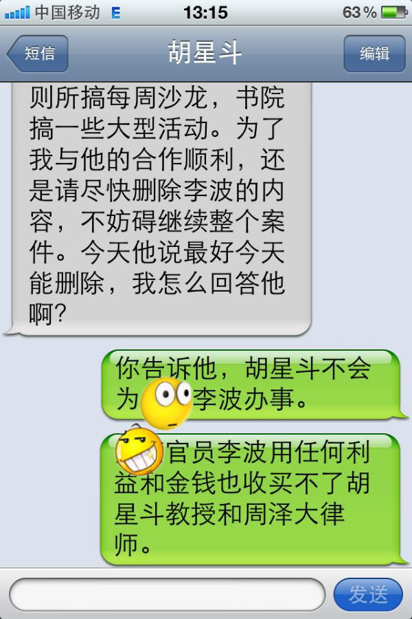 五、2011年9月23日20点09分,胡星斗教授发来手机短信:瑞峰:我见了周泽,他完全同意我的:不再涉及李波。他说他本来就没有涉及李波。我的联合会(国际著名企业家慈善家联合会)在刘东昌的五星饭店办公室里办公,而且我与他一起搞书院,今天他又催促我,不帮他快点解决我不好意思啊,甚至合作也出现问题。下次请你去我们的饭店办公室和书院参观,办公室将类似于天则所搞每周沙龙,书院搞一些大型活动。为了我与他的合作顺利,还是请尽快删除李波的内容,不妨碍继续整个案件。今天他说最好今天能删除,我怎么回答他啊?