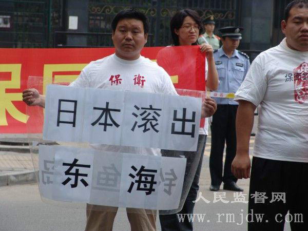 下午2点30分,示威的中国公民打着抗议的标语:“大陆台湾一家人”、“日本滚出东海”、“两岸携手共保国土”、“坚决抵制日本设定中国东海中间线”……,走到日本国驻华使馆前。