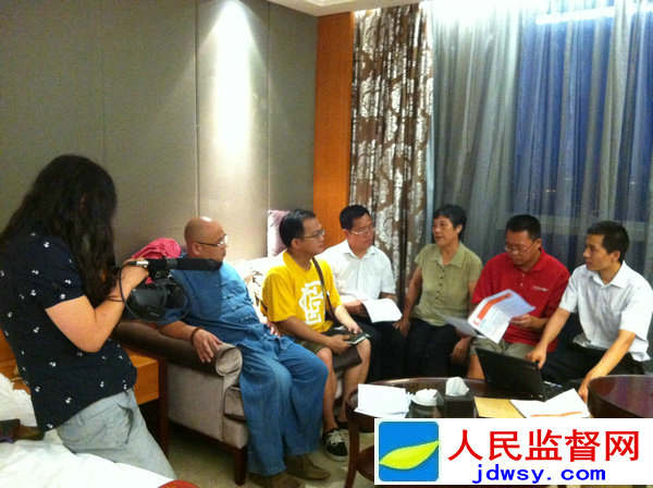 图:法学博士滕彪(右二);北京律师周世锋(右四);公民记者吴淦——网名:超级低俗屠夫(左二)、调查记者朱瑞峰(右一);纪录片编导许评修(左一)前往浙江上虞市调查企业家王苗珍(右三)被“官抢民财”案件