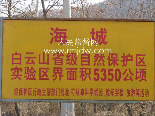 2008年10月28日,辽宁省设立了白云山省级自然保护区,面积5350公顷。然而,人民监督网记者于2009年11月2日在海城市孤山镇瓦子沟村采访时,却亲历着自然保护区界碑内炮声隆隆