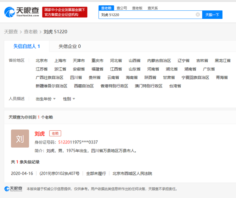 图:天眼查为你找到一个老赖刘虎