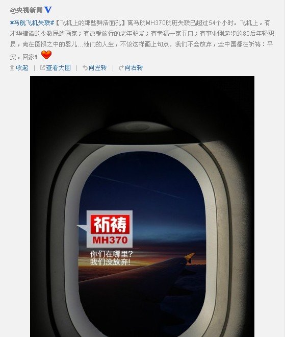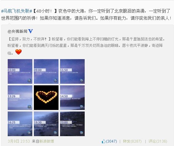 与此同时,新华视点官微,也在3月10日8:40发布了“只要有一线希望 就不放弃努力”的微博,称:“239个生命,154名同胞,你们好吗?”“MH370你在哪儿?亿万颗心的祈祷牵挂,一分一秒的煎熬等待,只愿真爱的光芒照亮生命的奇迹。”一家搜索引擎首页写道。一位网友说:“现在怀着宝宝,也每天拿着手机刷新微博,就是为了早点知道他们的消息,愿他们能安好。”