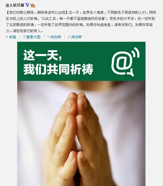 12个小时后,官微又转发了人民日报海外版的期待文章。称:我们仍耐心期待,期待奇迹可以出现。这一天,世界各个角落,不同肤色不同信仰的人们,同样在为机上的人们祈祷。“从此之后,每一天都不留遗憾地好好活着”。夜色中的太平洋,你一定听到了北京眼泪的奔涌,一定听到了世界范围内的祈祷。如果你知道消息,请告诉我们。如果你有能力,请庇佑我们的亲人。