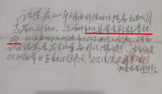 2010年6月,时任院长王建成同志带4位法官,共5位法官到新化。新化县政府有时任常务副县长李铁雄,政法委书记刘岚平参加,协商结论认为:属落实政策而非法侵权问题,并承诺由新化县政府牵头处理安置到位。