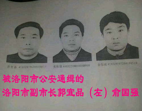图:曾被通缉的俞国强与洛阳市副市长郭宜品照片被贴至大街小巷