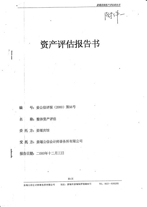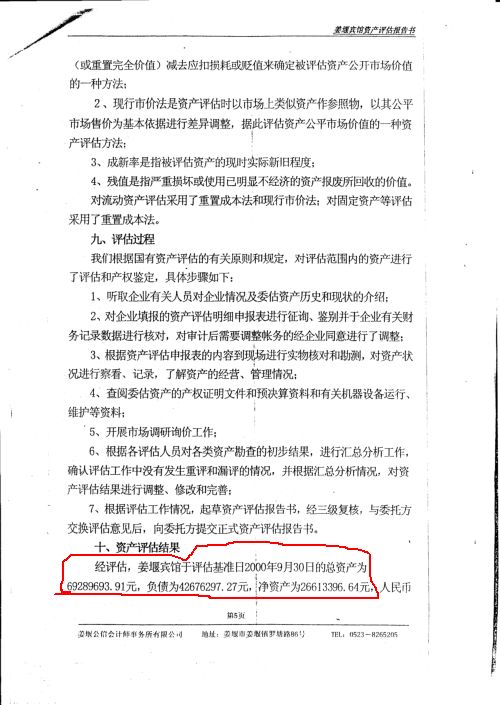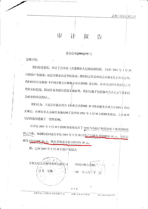 原政府招待所于2000年12月4日进行了整体资产评估,截止2000年9月30日创造的总资产为6928.96万元。负债4267.62万元,净资产为2661.33万元(见附件)。而法院民事裁定书上(见附件)截止2001年4月30资产总计2787.14万元,负债4340.59万元。从评估和法院裁定的时间间隔来年,短短七个月的时间,我们的总资产就流失4141.62万元?这显然不是事实,其中必有猫腻,用非法的评估,让“资不抵债”成为事实,难道这就是阳光政府的“阴谋”?