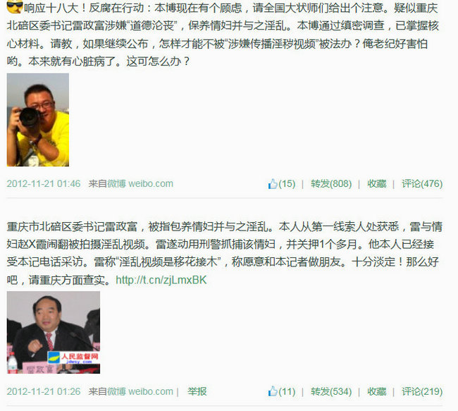 【转载与首发之别 纪许光脸皮堪比城墙】@纪许光 又开始表演了,不愧演艺大师称号。事实如下:人民监督网20121120日下午1641分首发雷政富12秒报道,当天晚上21点左右,纪在微博转载人民监督网的报道链接,后又删除,接下来纪开始重复以前的伎俩微博紧急高呼救命!但有推波助澜之功。