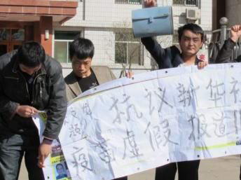 今天(3月20日)下午,据在山西太原采访山西疫苗丑闻的媒体记者介绍,下午六名问题疫苗家长在新华社山西分社门前抗议,在没有采访他们情况下就发布了不实报道。
