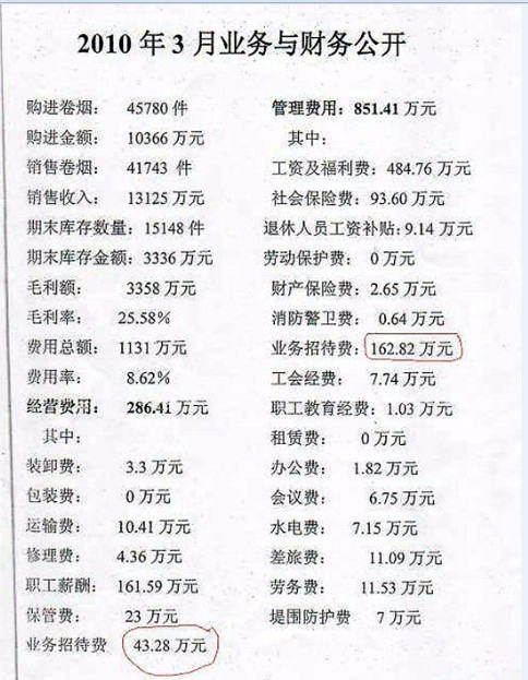 这笔招待费究竟是怎么回事?记者从网上看到这份发帖者所上传的“2010年3月业务与财务公开”表,发现该月份的“经营费用”和“管理费用”中果然有两笔“业务招待费”,分别为43.28万元和162.82万元,总额为206.1万元。