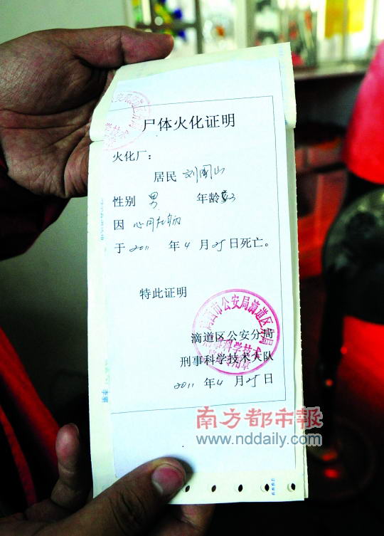 地方公安局为疑似遇难矿工开具的火化证明。 新华社发