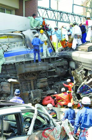 2005年4月25日,兵库县尼崎市,救援人员在搜寻幸存者。新华社发 日本 事故回放 拐弯速度过快 5节车厢脱轨 2005年4月25日,属于西日本铁道公司的一列城铁在行驶至神户塚口至尼崎路段时,刚二十出头的司机为了按规定准时抵达尼崎站,将时速提高到了100公里以上。在经过一个弯道时,过快的速度让列车7节车厢中的5节“飞出”铁轨,头两节更硬生生插入铁路旁的一栋公寓,导致107人遇难,500多人受伤。 原因调查 未在转弯处装 自动停止装置 2009年,神户地方检察厅以过失致死罪起诉山崎,后者当年辞职。 日本检察机关指控称,1996年,山崎并没有下令在施工弯道安装列车自动停止装置,最终导致2005年因司机超速行驶,引发严重脱轨事故。 此案于去年12月首次开庭, 日本检方要求法庭判处三年徒刑。本次开庭后,预计将在9月30日进行最后辩论,年内作出判决。 本报讯 尽管已经过去6年多的时间,但对2005年4月发生在神户尼崎市的城铁脱轨事件的追责依然在进行。29日,城铁所属公司——西日本铁道公司前社长山崎正夫在神户地方法院出庭受审。日本检方指控山崎犯有“业务过失罪”,要求法庭判处三年徒刑。 司机犯错社长有责 2005年4月25日,一向以高速、安全著称的日本城铁发生灾难性事故。 在经过一个弯道时,过快的速度让列车7节车厢中的5节“飞出”铁轨,头两节更硬生生插入铁路旁的一栋公寓,导致107人遇难,500多人受伤。 事故发生后,包括山崎正夫在内的西日本铁道公司高层集体向遇难者谢罪。2009年,神户地方检察厅以过失致死罪起诉山崎,后者当年辞职。 在调查取证后,日本检察机关指控称,1996年,西日本铁道公司在事发现场实施了弯道施工作业,在同类型的弯道已经发生过脱轨事故的情况下,当时作为西日本铁道公司最高安全负责人的山崎并没有下令在施工弯道安装列车自动停止装置,最终导致2005年因司机超速行驶,引发严重脱轨事故。 过失致人死伤罪 检方认为,如果在事发弯道处安装自动停止装置,就能够防止因为超速引发的事故。因此山崎正夫犯有“业务性过失致人死伤罪”,要求审理此案的神户地方法院判处山崎三年徒刑。 日本媒体报道称,在这次开庭之前,检方已经对涉案的证人和被告人进行了长达7个月的询问。 山崎本人和律师均称事故“无法预见”,事故弯道的危险性也无从提前认知,因此坚称无罪。 (新京报) 遇难者家属: “请尽量对他重判” 本报讯 29日开庭当天,2005年脱轨事故的遇难者家属也有不少人旁听,他们大多请求法庭对山崎予以重判。 现年71岁的藤崎光子在那场事故中失去了长女。她说,被告山崎在接受检方质询时屡次撒谎,他这种不诚实的态度,应该让大家都知道。 去年,山崎一案首次开庭时,这位执著的母亲就来到神户地方法院,将大量的事故调查资料一页页手写下来,希望能让更多人知道事故真相。 然而,初次公审让藤崎很失望,因为出庭作证的西日本铁道公司员工接连否认检方调查报告的内容。 她说:“当时我还想,只要尽可能接近真相就好,但多次旁听审案后,我就产生了一定要处罚山崎的想法。” 63岁的遇难者家属奥村恒夫说,“我希望能对山崎判以重刑,否则无法让死去的亲人瞑目,也没法向那些仍然痛苦不堪的伤者交代。”(新京报)