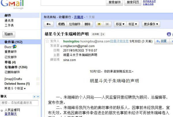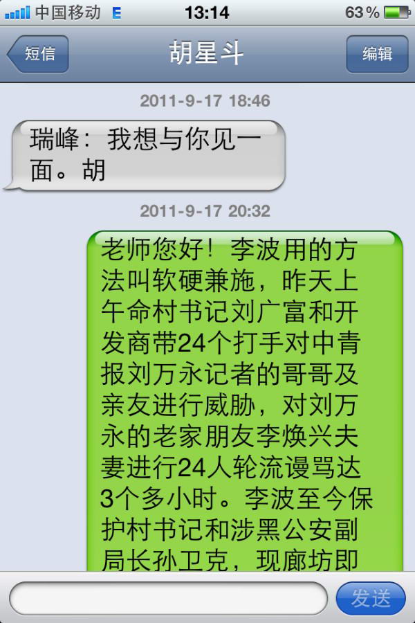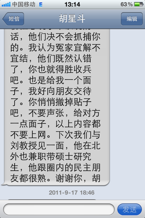 三、20119161823分,胡星斗教授发来手机短信:瑞峰:我的多年好友、原《瞭望》副主编、现北大一个研究院副院长刘东昌教授的亲戚正是那个廊坊秘书长,刘多次找我求情,希望能删除你网站上的帖子。刘与张祖桦、茅于轼都熟,属于我们圈子里的朋友。廊坊方面表示当初性急说了不该说的话,他们绝不会抓捕你的。我认为冤家宜解不宜结,他们既然认错了,你也就得胜收兵吧。也是给我一个面子,我好向朋友交代了。你悄悄撤掉帖子吧,不要声张,给对方一点面子,以上内容都不要上网。下次我们与刘教授见一面,他在北外也兼职带硕士研究生,他跟圈内的民主朋友都很熟。谢谢你,胡