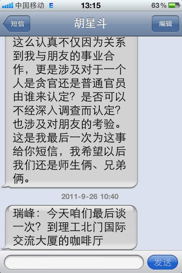 八、20119261040分,胡星斗教授发来手机短信:瑞峰:今天咱们最后谈一次?到理工北门国际交流大厦的咖啡厅。