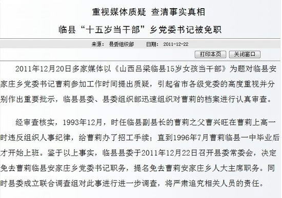 据新华社电 记者从山西省吕梁市临县新闻办获悉,被曝15岁当干部的该县安家庄乡党委书记曹莉22日被免职。
