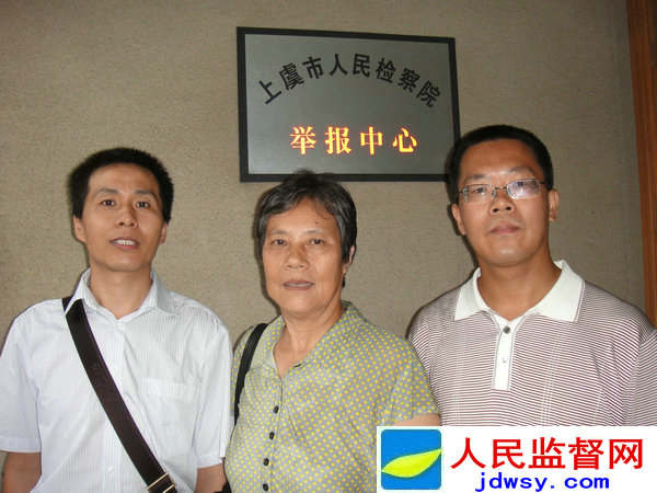 图:法学博士滕彪(右一)、访民王苗珍(中)、调查记者朱瑞峰(右三)在上虞市检察院