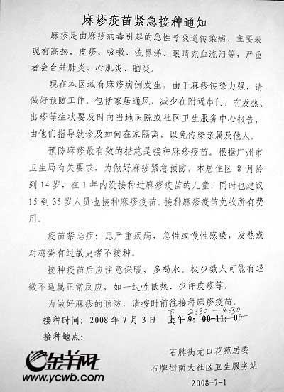 记者看到,其中一份《紧急通知》由石牌街龙口花苑居委和石牌街南大社区卫生站联合发出。《紧急通知》要求,辖区内8月龄到14岁、在一年内没有接种过麻疹疫苗的儿童,在今日下午 2:30—4:30在张贴通知的大楼一楼为市民接种麻疹疫苗。无论是否广州市居民,接种疫苗免收所有费用。该《紧急通知》同时建议15岁到35岁人员也接种麻疹疫苗。