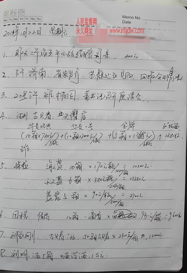 在他的近20本日记中,人民监督网记者初步统计发现,里面记录了他向近百名山东官员的行贿内容,上至山东省多名厅局级官员,下至一般公务员,涉及党政、国企、银行、公检法等各大机构;而行贿手段也花样百出,有送现金、烟酒、银行卡、购物卡、轿车、房产,有请境外旅游、红白喜事随礼、给贷款回扣……。